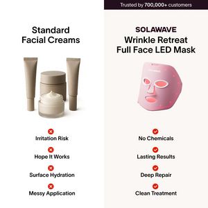 This square comparison template is designed to sell an at-home anti-aging skincare device—specifically a full-face LED mask—by positioning it against “standard facial creams.” The layout is a clean split-screen: the left column shows neutral-toned cream packaging with red X icons and concise pain-point bullets (irritation risk, messy application), while the right column spotlights a pink LED mask with red checkmarks and benefit claims (no chemicals, lasting results, deep repair). A dark top banner adds authority with a “Trusted by 700,000+ customers” statement, reinforcing social proof for mid-funnel consideration. The minimalist white background, bold sans-serif headings, and icon-based scanning make the message instantly legible on mobile feeds. This creative works because solution-aware shoppers are already comparing approaches; the template answers objections quickly, frames the device as cleaner and more reliable, and leverages aspiration (better results) plus authority (large customer base). Customize by swapping product imagery, adjusting the benefit list to match your claims, and replacing the trust banner with verified metrics (reviews, dermatology testing, clinical study stats) to maintain credibility.