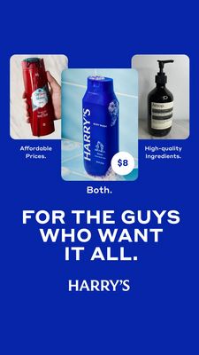 This template works because it resolves a common trade-off in men’s grooming—cheap vs. good—using a simple comparison frame and then collapsing it with the word “Both.” That leverages simplicity and choice reduction, ideal for solution-aware shoppers who already want a body wash but are evaluating brands. The top row visually anchors the category by showing “low-cost” and “luxury” cues, while the centered hero product inherits the best of each. The explicit price badge triggers value-savings without relying on aggressive discount language, supporting a mid-funnel consideration objective. Strong contrast (white on cobalt) and oversized typography follow mobile best practices: the promise is readable in a split second, and the ingredient-quality claim reassures quality assurance in the same scan.