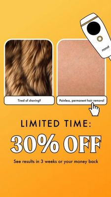 This template converts at the bottom of the funnel by stacking three proven decision triggers: a clear pain-point opener (“Tired of shaving?”), a bold limited-time discount, and a risk-reversal guarantee. The side-by-side tiles create an instant contrast that communicates “before vs after” without needing medical claims or long copy, aligning well with product-aware audiences who already understand IPL benefits. The oversized “30% OFF” anchors attention and gives a simple reason to buy now, while the “results in 3 weeks or your money back” line reduces hesitation around effectiveness—one of the biggest barriers for at-home devices. The warm, high-contrast palette and minimal elements keep readability high in Story placements, following best practices for fast-scrolling mobile inventory.