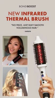 This 9:16 Story template promotes an infrared thermal brush designed to smooth frizz and add volume at home. The layout is built for fast scanning: a bold, uppercase headline in warm red announces the...