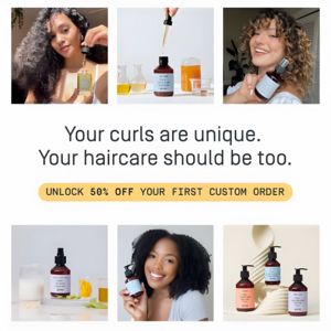 Designed for curl-focused shoppers who have tried generic products and now want a routine tailored to their texture, porosity, or goals (definition, hydration, frizz control). It resonates with mobile-first buyers who respond to inclusive model imagery and clear first-order incentives before committing to a custom regimen.