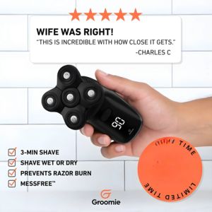 This creative works because it matches a product-aware, mid-funnel audience: shoppers already understand the category and need credible reasons to choose this specific shaver. The 5-star row and bold testimonial headline deliver instant social proof, reducing perceived risk and answering “Will it really shave close?” The in-hand product shot in a bathroom setting adds usage realism and signals convenience, while the checklist format translates key benefits into fast, scannable decision criteria (speed, wet/dry flexibility, irritation prevention, mess-free). The “LIMITED TIME” stamp introduces urgency as a secondary nudge—effective for consideration without feeling overly salesy. Overall, it follows best practices for electronics/grooming ads: clear hero, proof, prioritized claims, and a clean brand sign-off.