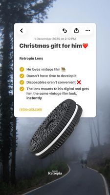 This 9:16 Story template promotes a camera lens attachment designed to give digital photos a vintage film look instantly—positioned as a “Christmas gift for him.” The design pairs a moody, foggy fores...