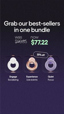 This Story-format template is built to sell an audio accessory bundle (earplugs/ear tips) by making the value proposition instantly obvious. The design uses a dark, textured charcoal-to-navy background with high-contrast white typography and a bright mint-green “now” price to pull attention to the deal. A struck-through “was” price anchors the savings, while a rounded “20% off” badge adds a second, easy-to-scan discount cue. The lower half presents three product color variants in a clean, evenly spaced row of rounded tiles, each paired with a simple benefit label (socializing, live events, focus). This is a bottom-of-funnel, product-aware creative: it assumes the audience already understands the category and needs a clear reason to choose this bundle now—savings and a best-sellers pack. Brands can customize by swapping product renders, updating the three benefit captions to match use situations, and adjusting the accent color to their brand while keeping the price hierarchy intact for conversion-focused performance.