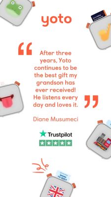 This Story-format template is designed to promote a screen-free kids audio player and its collectible audio cards. The layout is clean and testimonial-led: a large orange quote mark frames a centered review block, while the brand name sits at the top for instant recall. Around the edges, cropped product corners show the device with colorful cards inserted, creating a subtle collage that keeps attention on the product without cluttering the message. A Trustpilot 5‑star strip near the lower third adds recognizable third‑party validation and reinforces the social-proof trigger. Strategically, the creative fits mid‑funnel consideration for product-aware parents and gift buyers: it doesn’t explain what the product is from scratch, but it confirms it’s a loved, long-lasting purchase (“after three years”) and ties it to family bonding (“my grandson”). The warm white-and-orange palette feels friendly and kid-safe, while the generous whitespace increases readability on mobile. Customize by swapping the quote for a real customer review, updating the star source, and replacing the corner product shots with your colors/cards to match different brands or age ranges.
