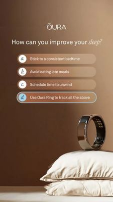 The template leverages curiosity and self-improvement by framing the message as a simple quiz: people instinctively want to “pick the right answer,” so attention stays on the copy long enough to introduce the product. Because it targets an unaware audience, it begins with universally accepted sleep tips (low resistance) and then positions the ring as the tool to track and validate those behaviors, creating an aspirational bridge from intention to action. The warm bedroom palette and minimal layout reduce cognitive load and build trust, while the final highlighted option acts like a visual CTA without relying on discounting. Best-practice elements include a single clear question, scannable answer bars, and a lifestyle-anchored product shot that communicates premium comfort in one glance.