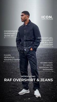 This 9:16 Story template is built for promoting a men’s coordinated denim overshirt and jeans set with a premium, urban feel. A full-bleed lifestyle photo of a model in dark-wash denim dominates the f...