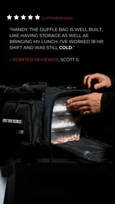 This template works because it combines two high-converting trust cues—star rating and a specific, verifiable-sounding testimonial—right at the top of the frame, then immediately “shows the proof” with a close-up of the insulated food compartment. That pairing reduces perceived risk for solution-aware shoppers who are already comparing organized travel/gym bags. The mention of an “18 hr shift” adds concrete performance context, making the cold-storage benefit feel real rather than promotional. As a mid‑funnel consideration asset, it’s optimized for readability in Stories (high contrast on a dark background) and for feature comprehension (product detail photo). It follows best practice by keeping one core message—durable bag + cold lunch storage—supported by social proof instead of extra claims.
