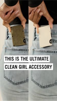 This Story-format ad template is built for a minimalist everyday-carry wallet or card holder. The visual is a clean split-screen comparison: two close-up shots of a hand holding a slim metal wallet over light denim pockets—one in a darker finish and one in a bright, white finish. The background stays lifestyle-real and uncluttered, while bold, all-caps typography sits on white bars for instant readability on mobile. Strategically, it’s a top-of-funnel awareness creative aimed at “unaware” scrollers. The headline “THIS IS THE ULTIMATE CLEAN GIRL ACCESSORY” leverages aspiration and trend language to create novelty and identity-based desire before the viewer even knows the brand. The side-by-side layout also subtly communicates choice (colorways/finishes) and portability without needing long copy. Customize by swapping the wallet finishes to match your SKUs, replacing the headline with your niche identity hook (e.g., “minimal commuter,” “gym bag essential”), and adding a small logo/URL or a simple CTA strip near the bottom for a retail-ready version while keeping the minimalist aesthetic intact.