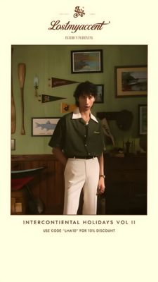 This 9:16 Story template promotes a menswear drop or capsule collection through an editorial, travel-lifestyle scene rather than a direct product packshot. A cream border frames a full-height photo of a male model in a dark olive short-sleeve shirt with a contrasting white collar and crisp white trousers, set in a vintage room with green panel walls, framed art, and nautical decor. The top area uses a refined script logotype for the brand name, while the bottom features a wide, spaced all-caps headline (“Intercontinental Holidays Vol II”) and a clear discount line with a promo code—perfect for TOF awareness with a light nudge toward conversion. The aesthetic trigger is strong: cinematic lighting, muted retro colors, and plenty of negative space signal premium taste and invite curiosity. This works well for style-conscious shoppers who buy identity and mood as much as garments. Customize by swapping the hero photo to match your seasonal color story, updating the collection title, and replacing the code/offer while keeping the elegant typography hierarchy for a high-end feel.