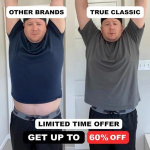 This square fashion ad template promotes a men’s comfort‑fit T‑shirt using a direct side‑by‑side comparison: “OTHER BRANDS” versus “TRUE CLASSIC.” The design is split-screen with two nearly identical poses, making fit differences the hero of the creative. High-contrast, bold uppercase typography sits in rounded labels at the top, while the bottom stack delivers the offer architecture: a white “LIMITED TIME OFFER” bar, a black “GET UP TO” pill, and a red “60% OFF” badge that immediately communicates value. The neutral indoor background keeps attention on the shirt drape and length, supporting the pain points of poor fit and discomfort. Strategically, this works at top-of-funnel for unaware shoppers: the visual “proof” is understood before any brand story is needed, leveraging curiosity and comparison to stop the scroll, then value-deal messaging to push clicks. Brands can customize by swapping shirt colors, updating discount/terms, and replacing the brand label while keeping the same high-clarity layout for rapid A/B testing across audiences.