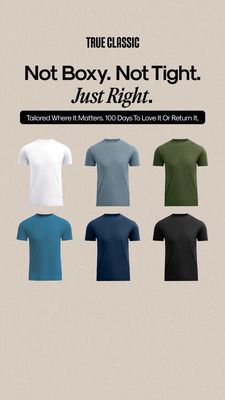 This template wins by pairing simplicity with choice. For an unaware, top-of-funnel audience, the headline structure communicates the core benefit—better fit—without requiring brand familiarity or technical details. The “Not Boxy. Not Tight.” phrasing is a fast contrast that helps viewers self-diagnose a common frustration, while “Just Right.” adds a confident, premium conclusion. The product grid then proves variety (multiple colors) and positions the t‑shirt as an everyday staple. Finally, the 100‑day return/love-it guarantee is classic risk reversal: it reduces perceived downside on apparel purchases where fit uncertainty is the #1 barrier. Clean typography, ample negative space, and a muted palette signal quality and trust, aligning with best practices for DTC essentials on Story placements.