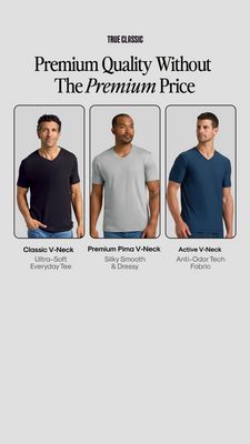 This 9:16 Story template promotes a men’s V‑neck T‑shirt lineup with a clear value promise: “Premium quality without the premium price.” The design is clean and catalog-like, using a light gray background, a classic serif headline for a premium feel, and three rounded-rectangle product panels that showcase different shirt colors and use cases. Each panel has a bold product name and a short benefit line (ultra-soft everyday, silky smooth & dressy, anti-odor tech), making comparison effortless. Strategically, this creative fits mid‑funnel consideration: the audience is already solution-aware and deciding between options. The trio layout leverages variety and aspiration (looking polished) while anchoring on value, reducing price resistance without discounting. The consistent lighting and neutral palette keep attention on fit, neckline, and fabric story. Brands can customize by swapping model shots, updating the three variants, and replacing benefit lines with their hero materials (e.g., organic cotton, stretch, sweat-wicking) while keeping the premium typography and structured comparison format.