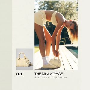 This square fashion ad template spotlights a mini handbag using a clean, editorial layout built for top-of-funnel discovery. A full-bleed lifestyle photo dominates the canvas: a model in pale athleisure bends in warm sunlight on a poolside deck, visually linking the bag to an active, outdoor-luxury routine. In the lower-left, a small product cutout on a light card acts as a quick “catalog” reference, while a minimal brand wordmark anchors credibility. The headline “THE MINI VOYAGE” is set in elegant, high-contrast serif caps with generous spacing, followed by a soft subline (“Now in Candlelight Yellow”)—a classic new-color-drop angle that sparks curiosity without hard selling. The neutral cream margins and sun-washed yellows create a premium, airy mood that feels modern and aspirational. This approach works for shoppers who buy on aesthetics and lifestyle association: the image sells the feeling first, then the product. Customize by swapping the lifestyle shot, updating the color name, and replacing the inset product image and wordmark to fit any accessories or athleisure brand launch.