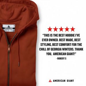 This square fashion ad template is built to sell a premium hoodie by turning a real-sounding customer review into the hero. The layout is split: a large, close-up product photo of a rust-red zip hoodi...