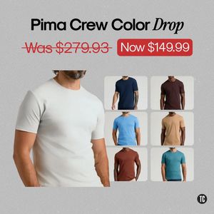 This square fashion ad template promotes a men’s Pima crewneck t‑shirt “Color Drop” with a clear, decision-stage offer. The layout is a clean split: a large lifestyle product-on-model image dominates the left side, while a neat 2x3 grid of alternate colorways sits on the right, instantly communicating variety without clutter. At the top, a bold headline (“Pima Crew Color Drop”) is paired with a high-contrast pricing treatment: the old price is crossed out in red, and the new price appears inside a red rounded rectangle for fast scanning. The light grey textured background keeps the focus on the garments and makes the red price pill pop. Strategically, this creative uses savings (anchoring with “Was” vs “Now”), choice/variety (multiple color thumbnails), and aspiration (well-fitted tee on a model) to reduce hesitation and push checkout. It’s ideal for product-aware shoppers comparing basics. Customize by swapping the headline, grid colors, and price pill to match your brand palette, and replace the model photo with your best-selling fit (slim, relaxed, tall) to align with your audience.