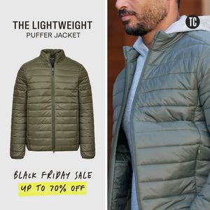 This square fashion ad template is designed to promote a men’s lightweight puffer jacket with a clear seasonal sales hook. The layout uses a clean split-screen structure: on the left, a studio product shot on a light gray background supports quick product evaluation; on the right, a close lifestyle crop shows the jacket worn, adding texture, fit cues, and aspirational context. The headline is set in bold, modern uppercase typography (“THE LIGHTWEIGHT PUFFER JACKET”), while the promotional message uses a handwritten-style font paired with a bright yellow highlight to make “UP TO 70% OFF” instantly scannable. This combination leverages discount urgency and the Black Friday trigger, ideal for mid-funnel consideration where shoppers are already product-aware and comparing options. The template works because it answers the two key questions fast—“What is it?” and “How does it look on?”—then adds a strong incentive to act. Customize by swapping jacket colorways, inserting your brand mark in the circular logo spot, and adjusting the discount band for your offer rules.
