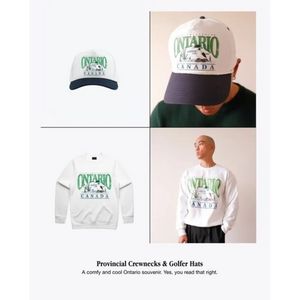 This square fashion ad template is built to promote a coordinated streetwear drop—specifically a graphic crewneck sweatshirt paired with a matching golfer cap. The design uses a clean 2x2 grid: product-only shots on the left (cap top, crewneck bottom) and lifestyle model photos on the right, creating an instant “see it / wear it” comparison that reduces hesitation in the consideration stage. A bright, minimal white background and thin black divider lines keep attention on the Ontario-style graphic in green and navy, while the bottom headline area (“Provincial Crewnecks & Golfer Hats”) works as a clear collection name and positioning statement. The overall feel is modern, editorial, and product-aware, tapping identity and aspiration triggers—viewers can imagine the look as part of their everyday uniform. Customize by swapping the graphic artwork, updating the collection title, and replacing the supporting line with sizing, fabric weight, or limited colorway notes to match your brand voice without losing the crisp, catalog-like clarity.