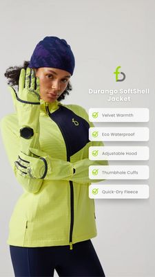 This 9:16 Story template is built for promoting a technical softshell jacket or similar cold‑weather outerwear. The design uses a clean, light-gray studio background with a full-height model photo on the left, letting the product color and fit do the selling. On the right, a clear headline (“Durango SoftShell Jacket”) sits above a vertical checklist of rounded white feature cards with green check icons—perfect for communicating performance specs at a glance. The minimal logo mark near the title keeps branding present without clutter. Strategically, the template is optimized for mid‑funnel consideration: the audience is already product-aware, so the creative shifts from inspiration to proof. The checklist structure reduces decision friction by translating technical benefits (warmth, waterproofing, adjustable hood, thumbhole cuffs, quick-dry fleece) into scannable claims. The neon-lime jacket against neutral space creates high contrast and an aspirational “active-ready” vibe. Customize by swapping the feature bullets for your brand’s key differentiators, adjusting the accent color to match your palette, and replacing the headline with a collection name or seasonal drop while keeping the checklist hierarchy intact.