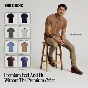 This square fashion ad template promotes a men’s “dressy” polo by pairing a clean studio lifestyle photo with a clear color-selection grid. The right side features a seated male model in a neutral beige polo and chinos on a wooden stool, set against a light gray background—an understated, premium look that keeps attention on fit and fabric. On the left, eight neatly framed mini product shots show available shades (Black, Navy, Moss, Heather Gray, Fiord, Truffle, Java, Blueberry), making comparison effortless. Typography is bold and editorial: an all-caps header (“TRUE CLASSIC”), a small product label, and a large value-driven line—“Premium Feel And Fit Without The Premium Price.”—that anchors the message for consideration-stage shoppers. The psychological triggers are style identity and aspiration (model styling + minimal set), reinforced by value (premium vs price). Brands can customize by swapping the color grid to match their catalog, replacing the headline with a specific offer, and adding a logo/URL or “Shop Now” button while keeping the balanced left-product/right-lifestyle structure.