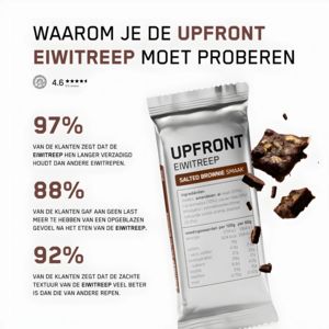 This square ad template is built to sell a protein bar (shown as a “UPFRONT” wrapper) using hard-hitting social proof and convenience-driven benefits. The layout is clean and editorial: a large all-ca...