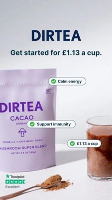 This creative matches a product-aware, mid-funnel audience by combining three fast decision drivers: value, credibility, and functional benefits. The “£1.13 a cup” cost-per-serving framing reduces price friction and lets shoppers benchmark against café drinks. The green check pill badges act as skimmable micro-claims, translating a complex formula (mushroom blend) into simple outcomes like calm energy and immune support. Social proof is reinforced with a prominent rating block, a best practice for consideration-stage ads where trust is the main blocker. Visually, the large packshot plus prepared drink clarifies what you receive and how it looks when mixed, while the minimal, bright background keeps attention on the product and claims without overwhelming the viewer.