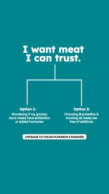 This Story-format template promotes a meat subscription or direct-to-consumer butcher delivery service by framing the purchase as a simple trust decision. A solid teal background creates a clean, modern canvas, while bold white headline typography (“I want meat I can trust.”) anchors attention fast on mobile. A minimalist decision-tree line splits into two labeled paths: Option 1 highlights the anxiety of grocery-store uncertainty (antibiotics/hormones), and Option 2 offers the reassuring alternative of a vetted box service with meats “free of additives.” The contrast is designed for top-of-funnel, unaware audiences: it introduces the problem they may not have articulated and immediately supplies a clear, low-effort solution. A rounded white CTA button at the bottom (“UPGRADE TO THE BUTCHERBOX STANDARD”) reinforces convenience and premium standards. Brands can customize by swapping the service name, adding certification badges (USDA, antibiotic-free), and adjusting the option text to match specific claims, cuts, or sourcing regions while keeping the binary choice structure that drives quick comprehension and clicks.