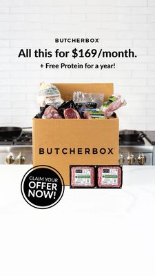 This 9:16 Story template is built for a meat or protein subscription box, spotlighting a clear monthly price and a high-perceived-value bonus. The design uses a clean, white brick kitchen backdrop with a centered, open cardboard box filled with vacuum-sealed cuts—an immediate “what you get” visual that reduces uncertainty for first-time buyers. Bold, black sans-serif typography places the value proposition front and center (“All this for $169/month”), while the secondary line (“+ Free Protein for a year!”) adds curiosity and deal appeal. A large circular badge CTA at the bottom-left (“Claim your offer now!”) mimics a sticker, creating urgency without clutter. This approach fits top-of-funnel awareness for an “unaware” audience: it quickly explains the product format (delivered box), anchors price, and stacks incentives to trigger convenience and value. Brands can customize by swapping the price, bonus, and box contents, or replacing the badge text with a seasonal hook (BBQ bundle, family plan, athlete pack) while keeping the minimalist kitchen setting for trust and freshness cues.