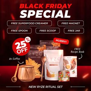 This square Black Friday template is built for a coffee-beverage bundle, specifically a premium “ritual set” featuring mushroom coffee, superfood creamer, and kitchen accessories. The design uses a da...