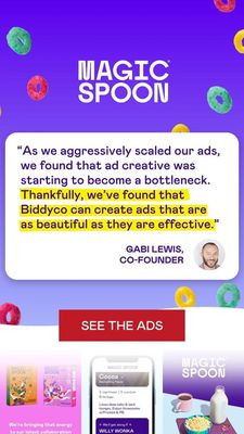 This creative wins by combining appetite appeal with credibility in a single Story frame. The playful cereal-ring background signals “food” instantly, while the large testimonial card does the persuasion work using social proof and authority (named founder + headshot). The yellow highlight guides attention to the core claim, improving skim readability on mobile and reducing cognitive load. Because the audience is product-aware and the funnel stage is consideration, the template focuses less on explaining what cereal is and more on removing friction (“ads were a bottleneck… these ads are beautiful and effective”), which functions as a trust transfer. The bottom product lineup and mobile-style screenshot reinforce legitimacy and choice, helping viewers imagine the purchase and click through with confidence.