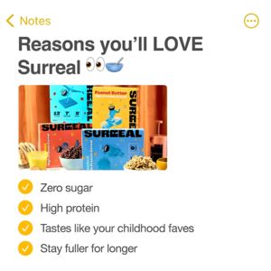 This creative works because it packages unfamiliar product claims into a familiar interface: a notes-style checklist. For unaware, top-of-funnel audiences, the pattern interrupt (phone UI + playful emojis) earns attention without feeling like a hard ad. The central variety-pack packshot triggers novelty and choice, while breakfast props cue craving and usage context. Benefits are framed as simple “wins” (zero sugar, high protein, nostalgic taste, longer satiety), reducing cognitive load and making the offer feel immediately relevant to health-conscious shoppers. The large check icons act as visual confirmation, reinforcing trust and readability on mobile. As a best practice, it balances brand/product visibility (multiple boxes) with scannable copy, making it easy to iterate by swapping bullets for macros, flavor highlights, or shopper objections as the audience moves toward consideration.