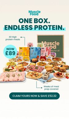 This 9:16 Story template is built for promoting a high‑protein meal prep box or frozen ready‑meal bundle. The design leads with a bold, stacked headline (“ONE BOX. ENDLESS PROTEIN.”) in dark teal on a clean off‑white background, with a turquoise highlight bar that makes the key benefit instantly scannable on mobile. The center is an abundance-style product collage: multiple branded meal packs, plates of prepared dishes, and raw protein on boards—visually communicating variety and quantity. A prominent circular price badge (“NOW £89”) and a savings CTA button (“CLAIM YOURS NOW & SAVE £52.32”) deliver a clear value-savings trigger, while small callouts (“40 high protein meals,” “Weeks of meal prep covered”) reinforce convenience for time-poor buyers. This fits mid‑funnel consideration for solution-aware audiences comparing options: it answers “what do I get and is it worth it?” quickly. Customize by swapping the bundle count, currency, badge color, and meal imagery to match different brands, dietary niches, or subscription offers without losing the high-contrast hierarchy.