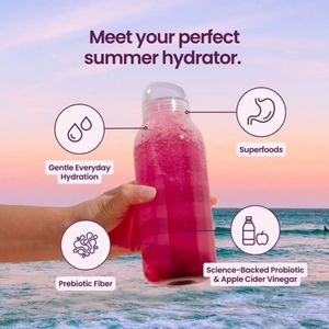 Health-conscious consumers looking for an easy, tasty way to stay hydrated in warm weather, especially people curious about gut-friendly functional beverages. Designed for mobile scrollers who respond to simple icons, clean claims, and a strong seasonal lifestyle cue before they’re ready to compare brands.