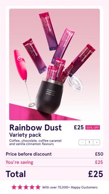 This 9:16 Story template is built for a beverage mix variety pack promotion with a checkout-ready, decision-stage layout. The top half showcases multiple single-serve sachets bursting from a matte black cup, supported by a bright pink milk frother and a clear lid—creating a premium “at-home café” cue that reinforces convenience and indulgence. A soft pink gradient background keeps the focus on the product while the rounded card frame adds a polished e-commerce feel. The lower section mirrors a cart/checkout summary: product name (“Rainbow Dust”), flavor list, bold current price, a “50% OFF” pill, and a quantity stepper. Value is anchored with “Price before discount” and “You’re saving,” then closed with a large “Total,” making the offer instantly scannable for product-aware shoppers. A 5-star row plus “75,000+ Happy Customers” adds social proof, reducing hesitation at BOF. Swap the pack name, flavors, currency, and discount badge to fit any coffee sticks, hot chocolate, or functional drink brand while keeping the same high-clarity pricing hierarchy.