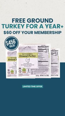 This creative is engineered for BOF decision-making: it assumes the viewer already understands the product and focuses on a concrete, quantifiable incentive. “FREE ground turkey for a year+” establishes an outsized anchor, while “$60 off your membership” adds an immediate discount to reduce friction. The circular value badge works as a fast visual heuristic—viewers can assess savings without reading fine print—supporting value-bundle perception. Scarcity is reinforced with the “Limited time offer” bar, a best practice for deal-led subscription acquisition. The clean, high-contrast typography and minimal palette keep the message legible on mobile, and the prominent product packaging provides tangibility and trust, helping convert comparison shoppers who need clarity on exactly what they’re getting.