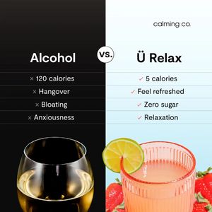 This square split-screen template promotes a calming, low-calorie functional beverage positioned as a smarter alternative to alcohol. The layout is a direct “Alcohol vs. Ü Relax” comparison: a dark, m...