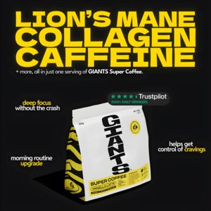 This square ad template is built for a functional “super coffee” or powdered coffee mix positioned as a morning routine upgrade. The design leads with an oversized ingredient stack headline in bold yellow (“Lion’s Mane / Collagen / Caffeine”), instantly communicating the product’s differentiators to solution-aware shoppers comparing options. A dark charcoal background with subtle spotlighting keeps the layout premium and performance-driven, while white supporting copy balances readability. The product packshot sits bottom-right at a slight angle, creating depth and anchoring brand recognition. Three benefit callouts (“deep focus without the crash,” “morning routine upgrade,” “helps get control of cravings”) act like scannable proof points for mid-funnel consideration. A prominent Trustpilot-style badge with star rating and “3000+ daily drinkers” adds trust signals and reduces perceived risk. This creative works because it combines clarity (what’s inside) with outcomes (how it helps) and validation (ratings). Customize by swapping the ingredient trio, benefit microcopy, and badge source (reviews, subscribers, retail partners) while keeping the high-contrast yellow/black hierarchy that makes the message impossible to miss in a crowded feed.