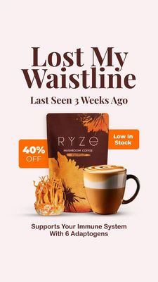 This template is optimized for top-of-funnel, unaware audiences by using a pattern-interrupt headline that reads like a personal result (“Lost My Waistline”), creating instant curiosity and a implied transformation story without requiring context. Once attention is captured, the offer is made frictionless: the high-contrast orange “40% OFF” badge delivers an easy-to-scan incentive, while “Low in Stock” adds scarcity to nudge immediate action. The centered pack shot plus latte visual anchors the message in a familiar coffee ritual, reducing perceived risk. A single, specific benefit claim—“supports your immune system with 6 adaptogens”—adds just enough functional credibility to justify the bold hook. Overall, it follows best practices for mobile Story ads: one hero product, two decisive badges, and minimal supporting copy for fast comprehension.