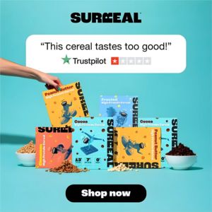 This square ad template is built for a breakfast cereal variety pack, showcasing multiple colorful boxes arranged like a mini shelf display. A bold brand wordmark sits at the top on a clean teal background, while a large white review card in the center features a punchy quote (“This cereal tastes too good!”) paired with a Trustpilot-style rating bar—immediately signaling credibility. The bottom section anchors the decision with a high-contrast black pill button that reads “Shop now,” making the next step unmistakable. Visually, the design balances premium minimalism (open negative space, rounded review panel) with appetite appeal (bowls of cereal and scattered pieces). The strategy leans on social proof and craving at a bottom-of-funnel decision stage: product-aware shoppers get reassurance that the taste matches the hype, plus a clear view of flavor variety. Brands can customize by swapping the quote, star rating, pack lineup, and CTA color, while keeping the teal studio backdrop and central review card structure for consistent, scroll-stopping clarity.