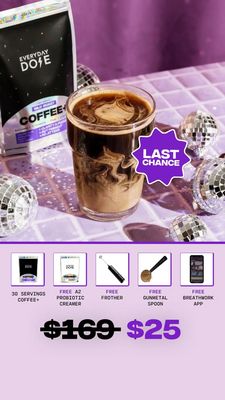 This 9:16 Story template is built for a direct-response coffee bundle offer. The hero image shows a creamy iced coffee in a clear glass with swirling milk, staged on a lilac tiled surface with disco-ball props for a fun, “treat yourself” vibe. A bold purple starburst badge reading “LAST CHANCE” creates immediate urgency, while the lower section shifts to a structured value stack: five small product/bonus tiles (servings, probiotic creamer, frother, spoon, app) followed by a dramatic price drop with the original $169 struck through and the new $25 emphasized in purple. The design uses high-contrast typography, clear hierarchy, and a clean divider line to guide the eye from craving to deal. This makes it ideal for bottom-of-funnel decision audiences already product-aware: the visuals reassure product quality, the bundle bonuses add perceived value, and the deadline framing pushes action. Customize by swapping the pack shot, adjusting the bonus row to your bundle, and matching the badge and price color to your brand palette while keeping the strong discount emphasis.