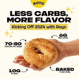 This square food-and-beverage ad template is designed for a packaged, better-for-you bakery item—specifically a low‑carb bagel. The layout uses a clean off‑white background with a bold, black, all-cap...