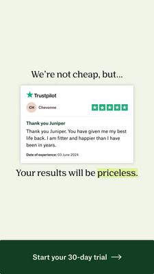 This 9:16 Story template is built for premium health & wellness services—think online fitness coaching, lifestyle transformation programs, or guided habit plans that may cost more but deliver clear outcomes. The design is minimalist and credibility-led: an off‑white background, a centered Trustpilot-style review card with a 5‑star row, and elegant serif headlines that frame the testimonial. The message “We’re not cheap, but…” directly addresses price objections, while the closing line “Your results will be priceless.” reframes cost into value. From a marketing perspective, it’s a mid‑funnel consideration asset aimed at solution‑aware audiences comparing options. It uses social proof (named reviewer, date, star rating) to reduce risk and aspiration language (“best life back,” “fitter and happier”) to trigger desire for transformation. A dark green bottom bar CTA—“Start your 30‑day trial”—adds a value-driven entry point without sounding pushy. Customize by swapping the review text, keeping the high-contrast green accent for trust, and aligning the testimonial card to your platform’s verified review source or client quote format.