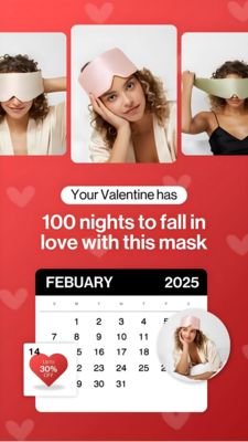 This creative sells a sleep mask through romance and curiosity—two powerful TOF triggers for an unaware audience. The Valentine framing makes the item feel like an easy, thoughtful gift, while the “100 nights” promise reduces perceived risk and invites a low-pressure experiment. The calendar visual is a best-practice cue: it translates an abstract guarantee into a concrete timeline people can picture, improving comprehension in fast-scrolling Story placements. Multiple lifestyle shots quickly demonstrate fit and color options, building desirability without technical claims. The small heart-shaped discount acts as a secondary incentive, nudging action while keeping the main narrative focused on “try it and fall in love,” which is more emotionally persuasive at awareness stage than feature-heavy copy.