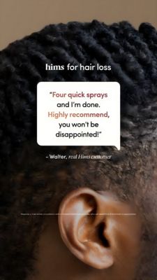 This template works because it pairs two high-performing TOF triggers: social proof and convenience. The quote format reads like a message from a peer, lowering resistance for users who are “unaware” or only mildly concerned about thinning. Highlighting a simple ritual (“four quick sprays”) reframes treatment from a medical-sounding commitment into an easy habit, reducing perceived time and friction—key for mobile audiences. The extreme close-up lifestyle crop anchors the promise to the scalp without needing clinical claims, while the high-contrast white bubble ensures the testimonial is the hero on a fast-scrolling Story placement. As an awareness creative, it earns the click by building trust first, then inviting the viewer to learn more about how the spray fits into everyday life.