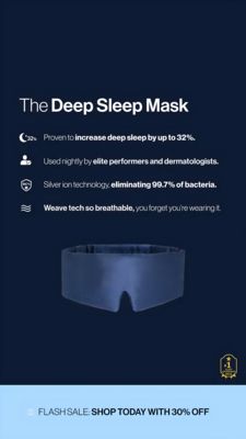 This 9:16 Story ad template is designed to sell a premium deep-sleep eye mask by stacking measurable proof points in a clean, science-forward layout. A dark navy background creates a nighttime cue, while the centered product render (matte blue mask) anchors attention and keeps the design product-first. Above it, a large headline (“The Deep Sleep Mask”) is followed by four icon-led benefit lines: increased deep sleep up to 32%, used by elite performers and dermatologists, silver-ion hygiene eliminating 99.7% of bacteria, and breathable weave comfort. The structure is ideal for mid‑funnel consideration: it answers “why this mask, not another?” with quantified claims, authority cues, and cleanliness reassurance—key triggers for health-conscious buyers. A pale blue bottom bar adds contrast for a flash-sale message and clear CTA, while a small award-style badge supports credibility. Brands can customize by swapping the benefit metrics, icons, and badge, and by matching the bottom bar to seasonal promos without losing the calm, sleep-ready aesthetic.