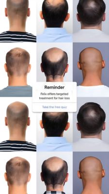 This template converts attention by combining curiosity and insecurity relief: the multi-photo grid lets viewers instantly compare different thinning patterns and self-diagnose (“That’s me”). That self-identification is powerful at TOF because the audience is problem-aware but not yet brand-committed. The centered notification-style “Reminder” card feels native to mobile UX, lowering resistance and increasing perceived relevance. Offering a “free quiz” is a low-friction CTA that matches early-funnel intent and captures lead data without demanding immediate purchase. Visually, the neutral, clinical palette and consistent rear-head framing reduce distraction and signal seriousness—an important best practice for sensitive personal concerns like hair loss.