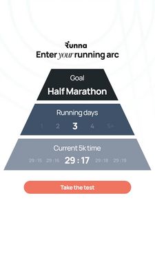 This creative works because it turns a complex decision (how to train) into a simple, three-step self-assessment. For an unaware TOF audience, the pyramid layout provides instant context without demanding prior knowledge: goal → weekly commitment → current benchmark. That structure triggers curiosity (“Where do I fit?”) and self‑improvement motivation, while the “Half Marathon” label adds a concrete challenge. Highlighting a single option (3 running days) models the interaction and nudges users to imagine selecting their own value. The high-contrast coral CTA reduces friction by framing the next step as a test, not a purchase—an effective best practice for awareness campaigns that need clicks and leads before pitching subscriptions or coaching plans.