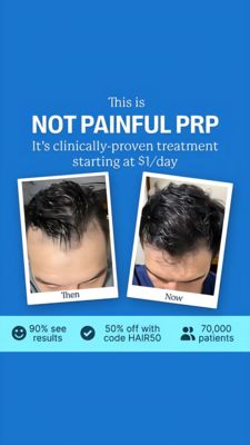 This template works because it pairs a top objection-killer (“NOT PAINFUL”) with concrete proof and authority cues, matching a solution-aware audience evaluating PRP versus alternatives. The large headline stops the scroll, while “clinically-proven” signals medical legitimacy—critical in health advertising. The centered Polaroid before/after creates instant, low-effort verification of results, and the bottom icon row stacks social proof (70,000 patients) with outcome framing (90% see results) and a value incentive (50% off code). That combination is ideal for mid‑funnel consideration: it reduces perceived risk, adds trust, and gives a clear next step for users who need reassurance before committing to a consultation.