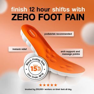 Designed for adults who experience foot pain from standing or walking all day—especially shift workers (healthcare, retail, warehouse, hospitality). They compare solutions, want proof (expert recommendation and ratings), and respond strongly to clear savings like codes and percentage-off offers.