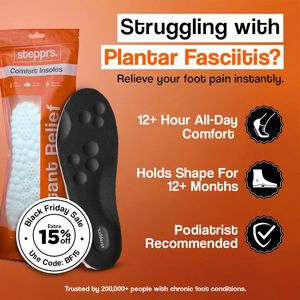 Adults dealing with plantar fasciitis, heel pain, or fatigue from standing and walking—especially workers on their feet (retail, hospitality, healthcare). They’re solution-aware shoppers comparing insoles and looking for credible proof, durability claims, and a compelling discount to act now.